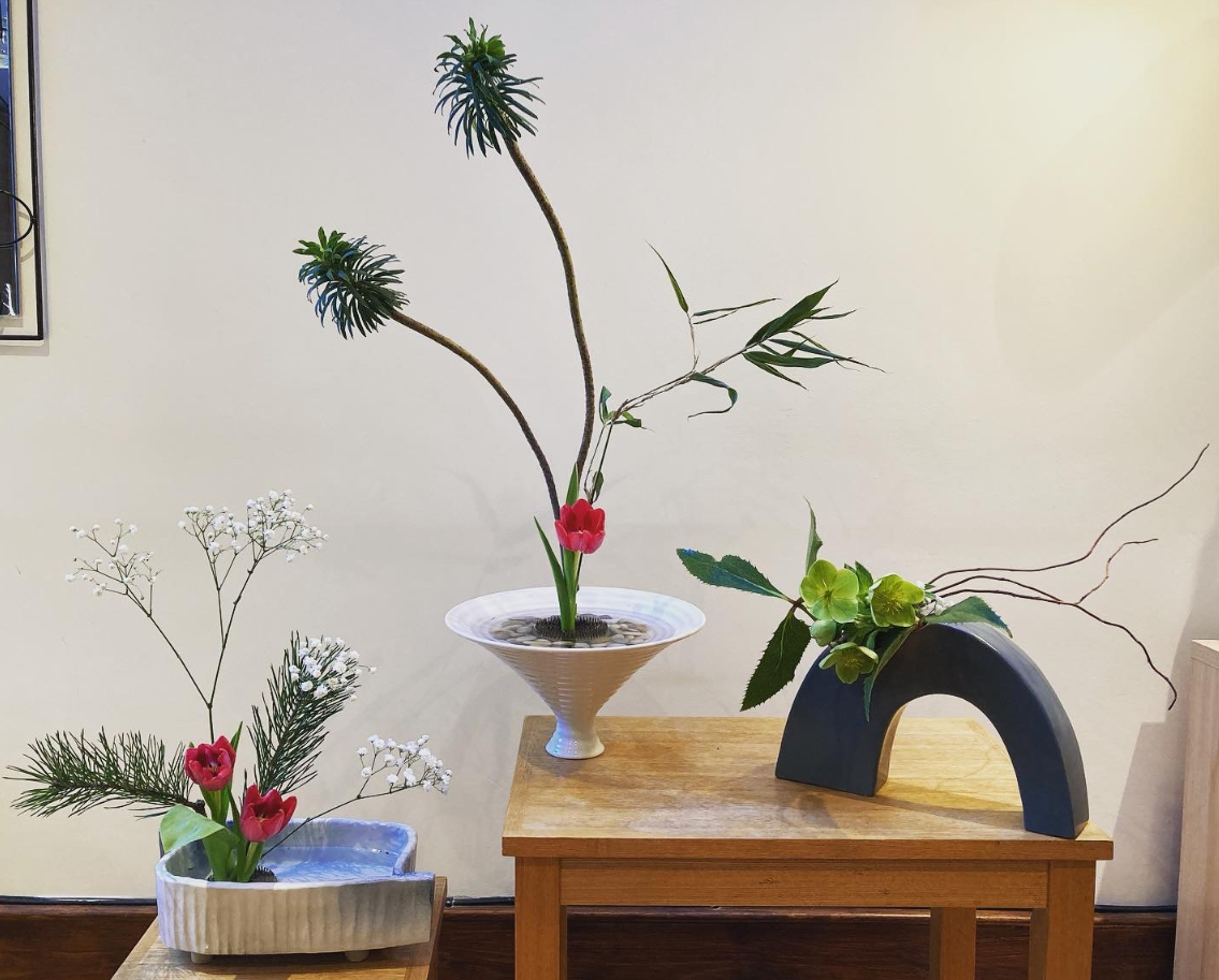 In the midst of the winter, especially now in the midst of the pandemic, our thoughts and feelings tend to go a bit down or negative. Yet it is the very time when nature is working hard toward the spectacular burst in spring. While walking in our nearby park in Ealing, West London, on a cold grey morning I noticed small shoots pushing out from the cold and wet earth covered in dead leaves and branches. This was a confirmation for my hope that spring is approaching. This inspired me to think about how I can create an Ikebana (Japanese art of flower arrangement) composition. A friend, living nearby in Ealing, had given me some flowers the day before. I wanted to create an Ikebana arrangement expressing hope and spring using these flowers together with some greeneries and dead looking branches that I collected.